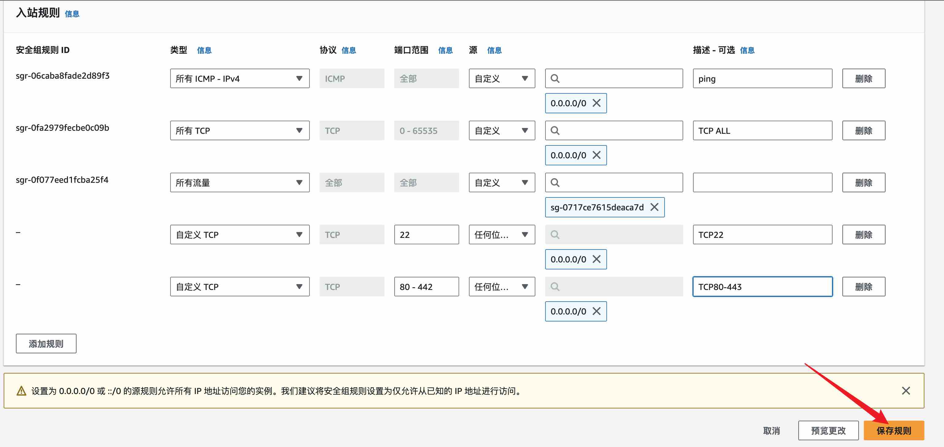 3、以端口全开、开放22端口、80-443端口、ICMP 协议(ping协议)为例,配置好后点击保存。