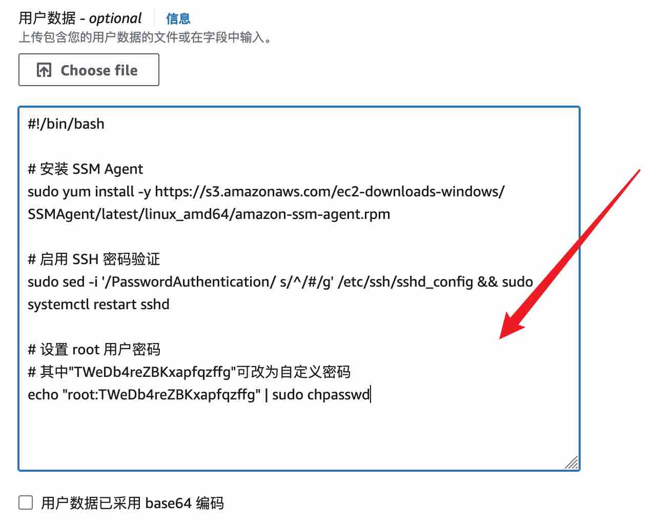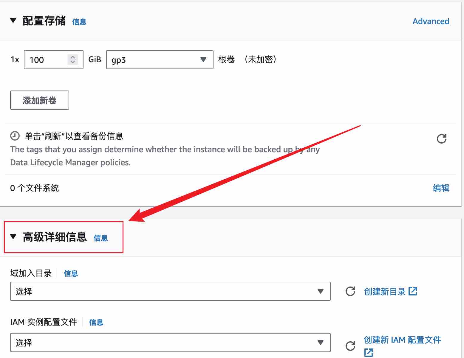 4. 展开"高级详细信息" 拉到最下方"用户数据"的地方复制以下shell脚本